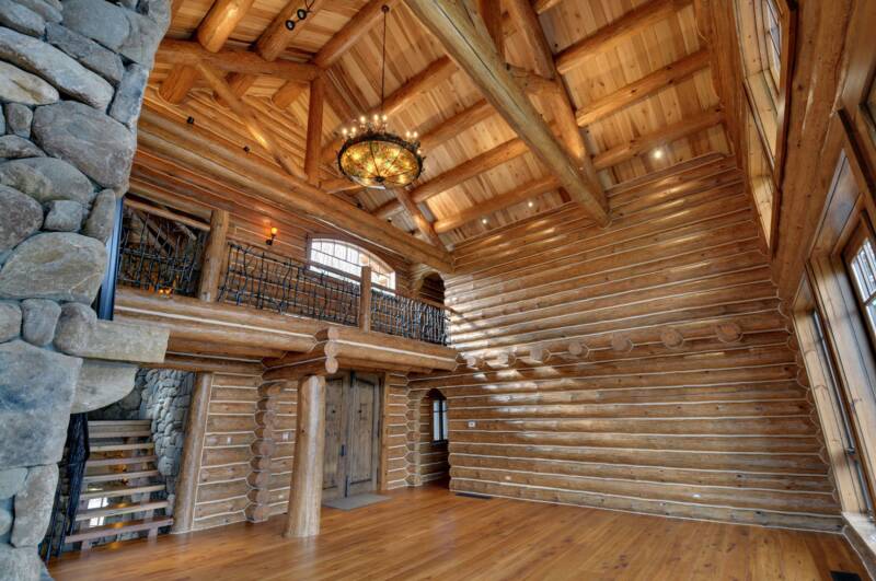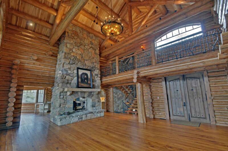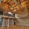 The great room boasts a soaring 28' ceiling-height, magnificent double-sided stone fireplace, giant Meyda Tiffany chandelier, low voltage scene lighting, an upper level catwalk, grand front door entrance with porch & foyer.