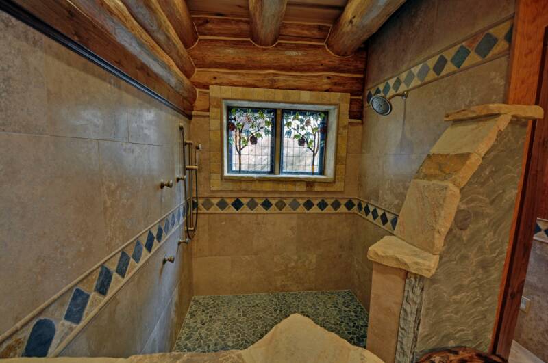 Master Bath features a luxurious walk in shower with a 3-way body spray system, an auto-sensing humidity exhaust system, radiant heated stone shower floors, and a custom made stained glass window.